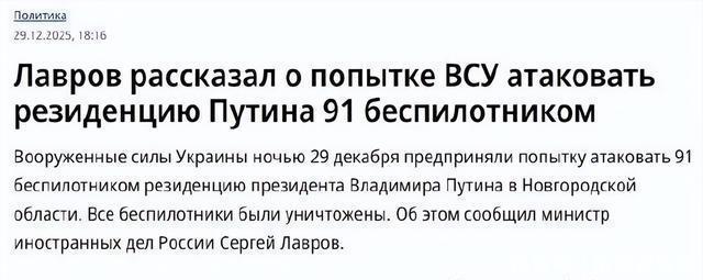 从特朗普的表态来看,特朗普关于此事的信息源完全来自普京的电话,对此感到“震惊和愤怒”,“无法想象如此疯狂的行为”,并未听信乌克兰政府的否认,甚至很可能都没有听取来自美国情报部门的报告,这也再次证实,特朗普不仅十分信任普京,而且在对重大事件的处理上缺乏专业性,无法做到在听取广泛报告后再做出自己的判断,换句话说,很容易被人“忽悠”。 俄罗斯政府宣称乌克兰袭击普京官邸,很可能正如乌克兰方面所言存在多个目的。 拉夫罗夫在指责乌克兰用无人机袭击总统官邸时,也在声明里实际上否认了美乌“20点和平计划”,强调乌克兰及其支持者必须承认克里米亚和乌克兰东部四个州(应该是不包括尚未占领的领土)已加入俄罗斯的“领土现实”。